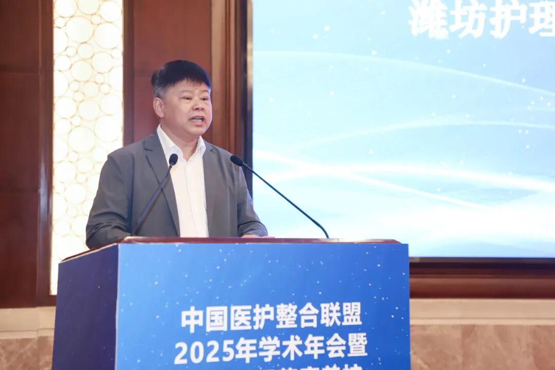 潍坊护理职业学院党委书记崔照忠在大会上致辞。他表示,2018年在樊代明院士的高瞻远瞩与鼎力支持下,中国医护整合联盟应运而生。自成立以来,中国医护整合联盟始终秉持“整合医学”理念,聚焦复合型医护人才培养,深耕不辍医护整合,取得了丰硕成果。学院将“整合医学”理念深度融入办学实践,在创新构建“三维三融”人才培养体系、产教融合、突出中医药办学特色等方面取得了显著成绩。他表示,学院将充分吸收年会的智慧成果,融入“双校双院”协作提升行动,助力潍坊打造山东医学新高地,服务全省卫生健康事业高质量发展,与联盟成员单位一起为建设教育强国、健康中国贡献更多“联盟智慧”,注入更强“潍护力量”!
