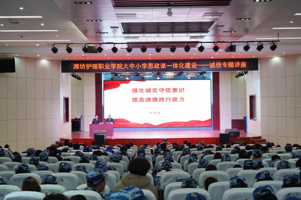 (通讯员:李文莉)为深入推进大中小学思政课一体化建设,引导广大师生自觉践行社会主义核心价值观,10月29日,“我们的价值观,我们的中国梦”主题宣讲活动走进潍坊护理职业学院,为师生带来一场以诚信为主题的精神洗礼。潍坊护理职业学院党委副书记苏建福主持活动。