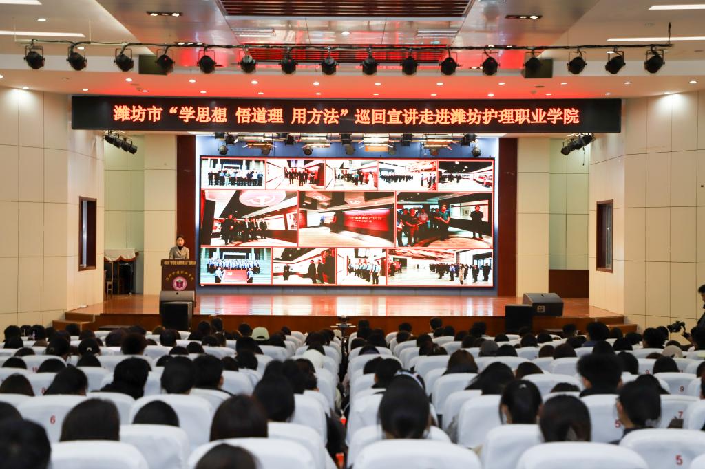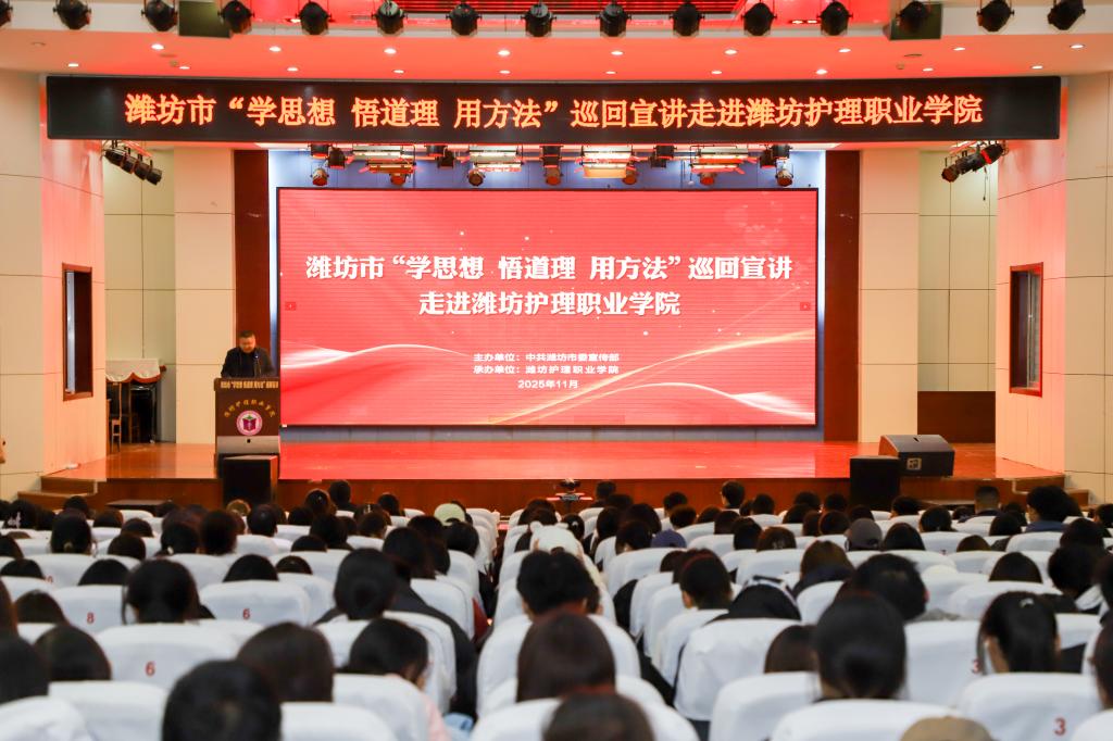 为深入学习贯彻习近平新时代中国特色社会主义思想,推动党的创新理论进校园、进课堂、进头脑,11月3日下午,潍坊市“学思想 悟道理 用方法”巡回宣讲活动走进潍坊护理职业学院,为师生带来一场有深度、有温度的理论宣讲和精神洗礼。潍坊市宣传文化服务中心副主任王海军,学院党委副书记苏建福,党委委员、宣传部部长郭兴华,青州市委宣传部副部长王庆周出席活动。
