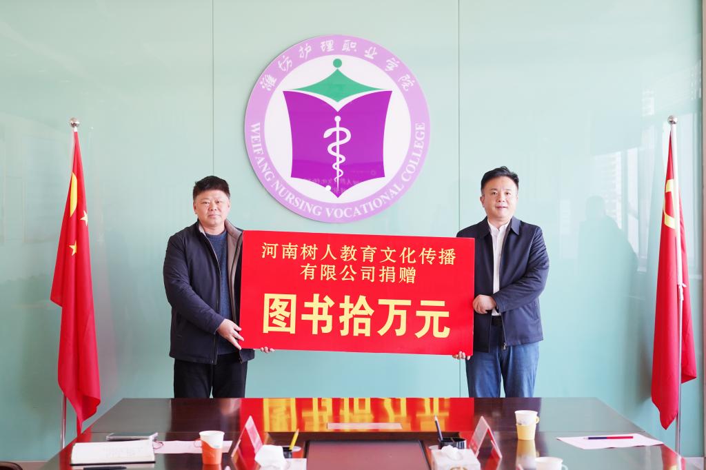 河南树人教育文化传播有限公司董事长张曙光、潍坊护理职业学院院长王文军出席捐赠仪式。王文军对企业的慷慨捐赠表示衷心感谢,他强调,这批图书将丰富学校图书信息中心馆藏,为学校教学科研工作注入新的活力。张曙光董事长介绍了企业发展概况,指出作为教育文化传播领域的骨干企业,此次捐赠是企业履行社会责任,助力医药卫生职业教育高质量发展的重要举措。