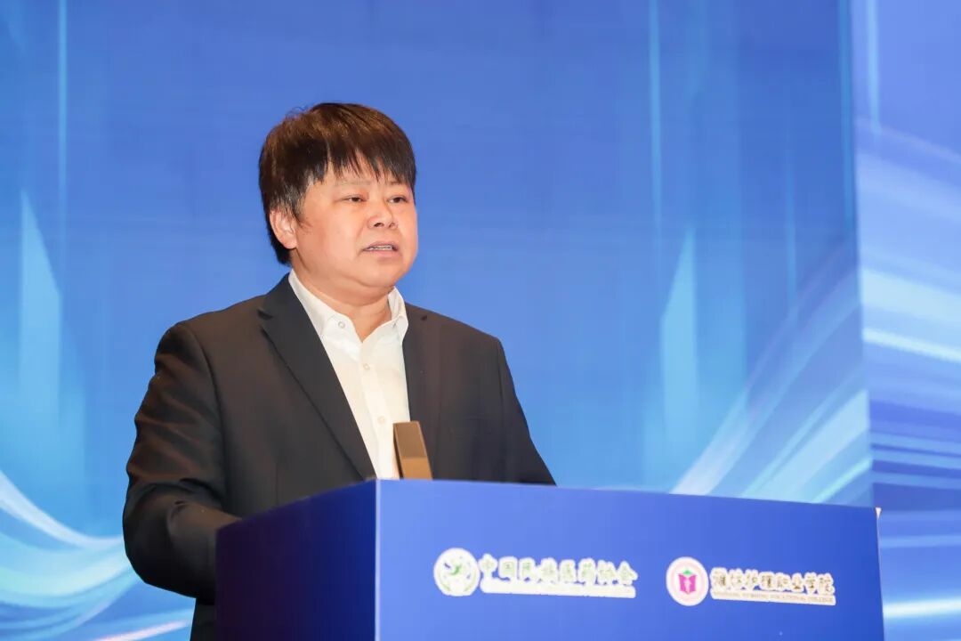 潍坊护理职业学院党委书记崔照忠致辞。他表示,当前正值全面推进健康中国建设的关键阶段,公共卫生专业委员会的成立恰逢其时,对于推动民族医药与公共卫生深度融合意义重大。他在致辞中介绍了学校近年来高质量发展取得的显著成绩,表示学校作为牵头发起单位,将以高度的使命感履行职责,充分依托学校的办学优势,大力推广中医适宜技术,与业界同仁携手协同攻关公共卫生重点领域,加强公共卫生与民族医药复合型人才培养,让专业委员会成为推动行业发展的坚实力量,为构建强大的公共卫生体系、护航人民健康贡献力量。