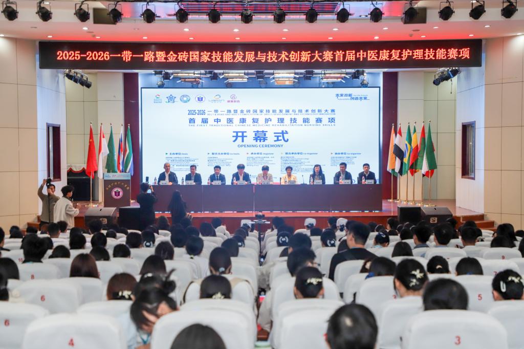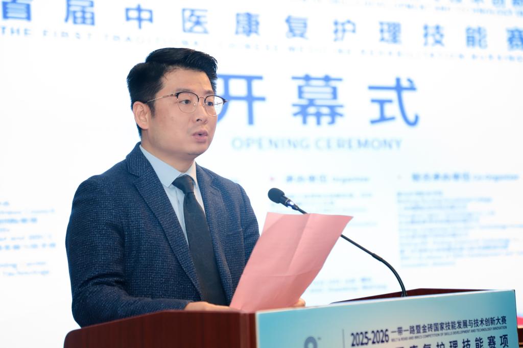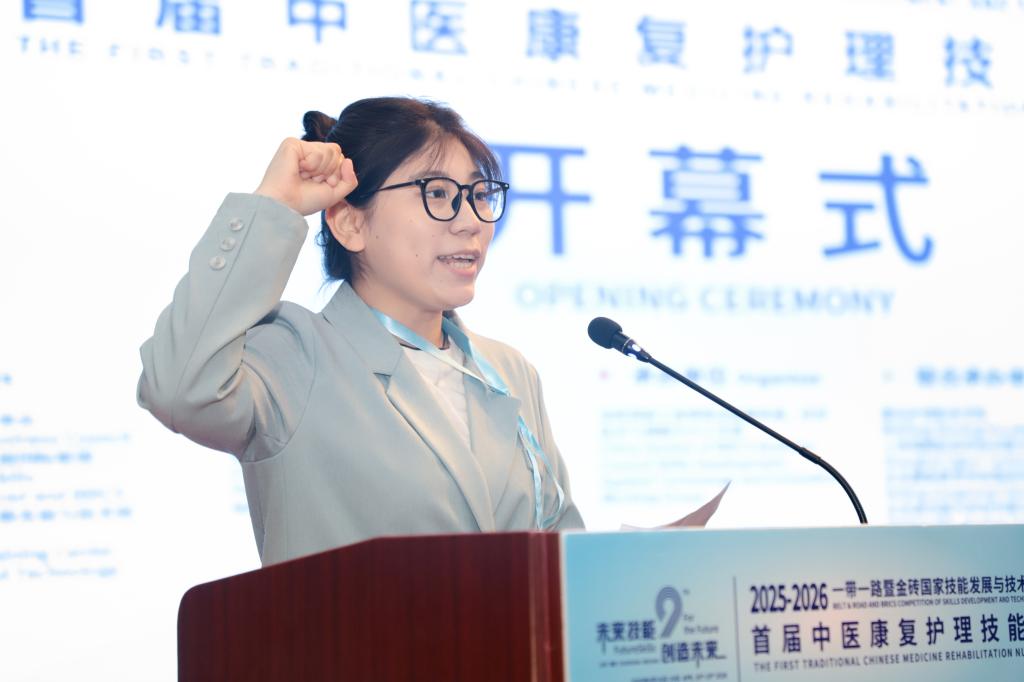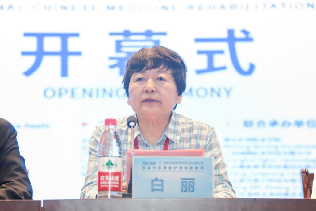 白丽在致辞中表示,本次大赛是金砖国家技能合作与教育交流的重要平台,赛事紧扣“未来技能创造未来”发展愿景,聚焦中医康复护理核心领域,搭建了国际化、专业化竞技舞台,对推动中医康复护理标准化、规范化、国际化发展具有深远意义。