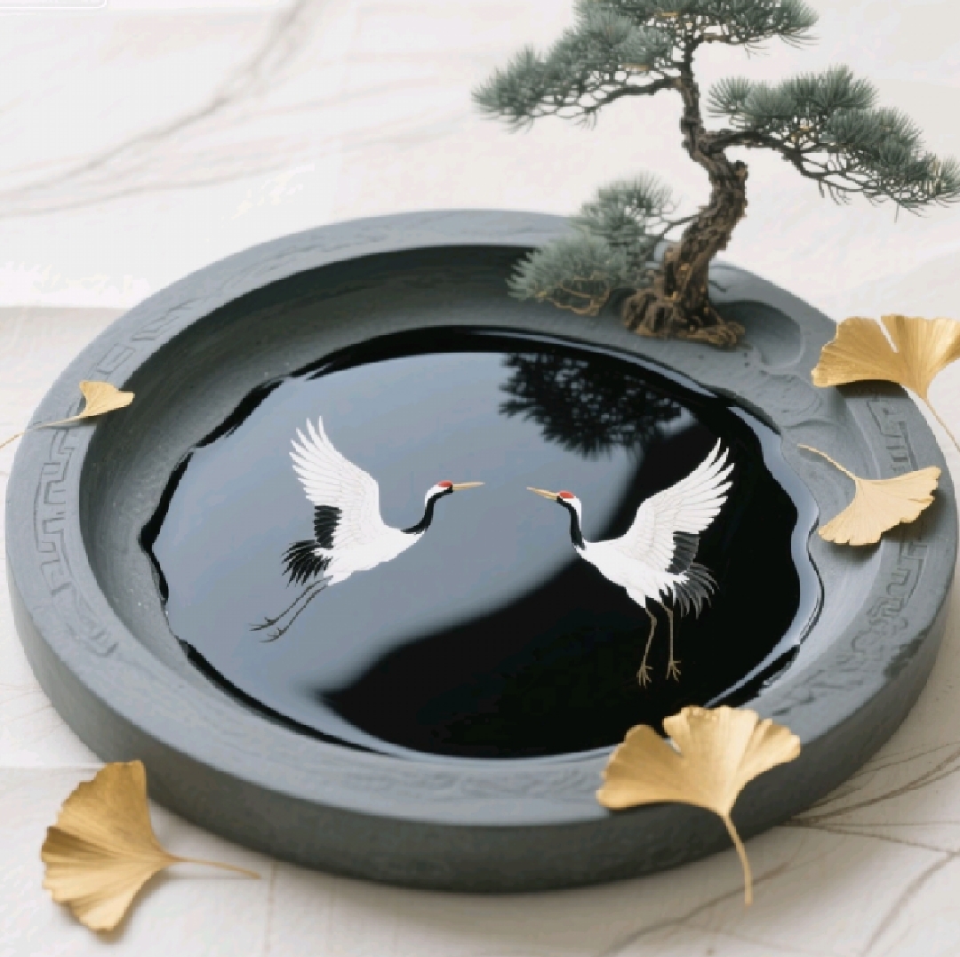 作品以砚台为核心载体,砚池墨色如镜,映出双鹤翩跹之姿,寓意“鹤立廉洁,心正身清”;旁植劲松,象征坚韧不屈的廉正品格,金色银杏叶点缀其间,增添典雅气韵。整体融合传统文房元素与吉祥意象,通过松鹤的文化寓意传递“守廉如松之挺拔、鹤之高洁”的精神内核,视觉上以水墨质感与金属色调形成对比,既具古典美学的雅致,又以新颖的组合形式强化廉洁文化的艺术感染力,让观者在传统符号的现代演绎中,感知廉德铸魂的深层内涵。